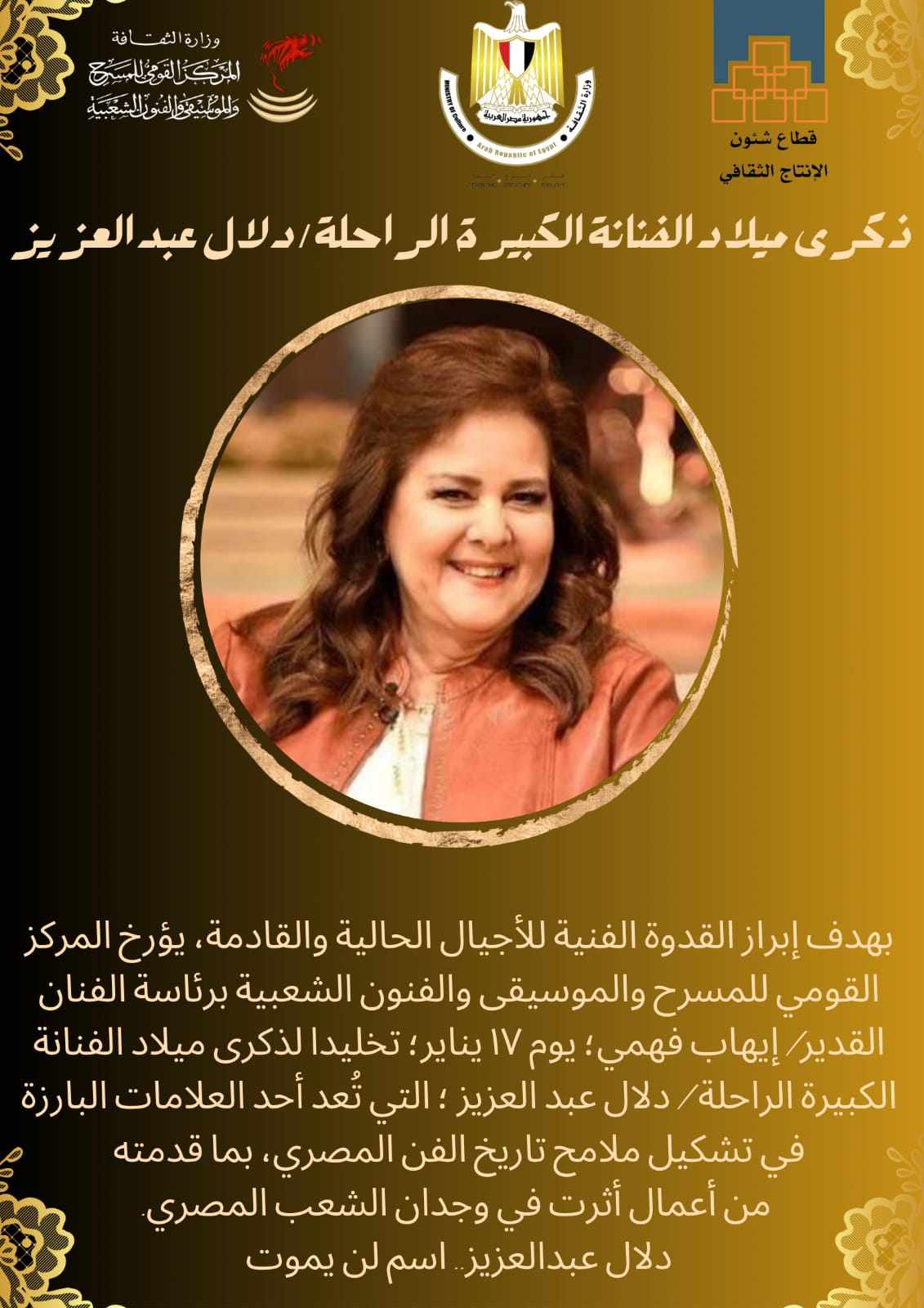 وأضاف فهمي: بدأنا يوم ١٣ يناير بالتذكير بذكرى مولد الفنان الكبير الراحل حسين رياض، ثم الفنان الراحل سمير غانم الذي مرت ذكرى ميلاده أول أمس الاثنين الموافق ١٥ يناير، ويوافق اليوم ١٧ يناير ذكرى ميلاد الفنانة الراحلة دلال عبد العزيز.