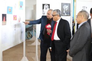 بدوره قام الدكتور طلعت شحاته رئيس قسم التربية الفنية والمشرف على المعرض والطلاب ، المشاركون فى المعرض بتقديم شرح عن اللوحات المعروضة التي تنوعت موضوعاتها وعبر من خلالها الطلاب عن أفكار متنوعة ، وضمت معروضات المعرض اعمال رسم بالقلم الرصاص ، ودرجاته وأعمال تصوير زيتي يبرز شخصيات وموضوعات من المجتمع المصري ، ولوحات ديجيتال وأعمال أشغال فنية .