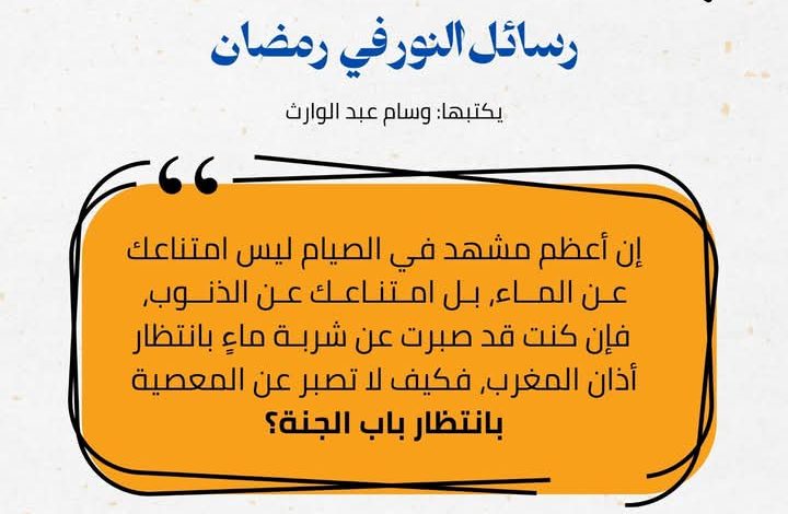 فإن كنت اليوم قد صبرت عن شربة ماءٍ بانتظار أذان المغرب، فكيف لا تصبر عن المعصية بانتظار باب الجنة؟