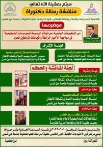 ويترأس لجنة المناقشة والحكم علي الرسالة: الأستاذ الدكتور محمد معوض إبراهيم، أستاذ الاعلام بكلية الدراسات العليا للطفولة والدكتورة نفيسة صلاح الدين، ويناقشها الأستاذة الدكتورة نرمين زكريا خضر، عميدة كلية الإعلام بالجامعة العربية المفتوحة، والأستاذة الدكتورة اعتماد خلف معبد، أستاذ الإعلام وثقافة الأطفال جامعة عين شمس.