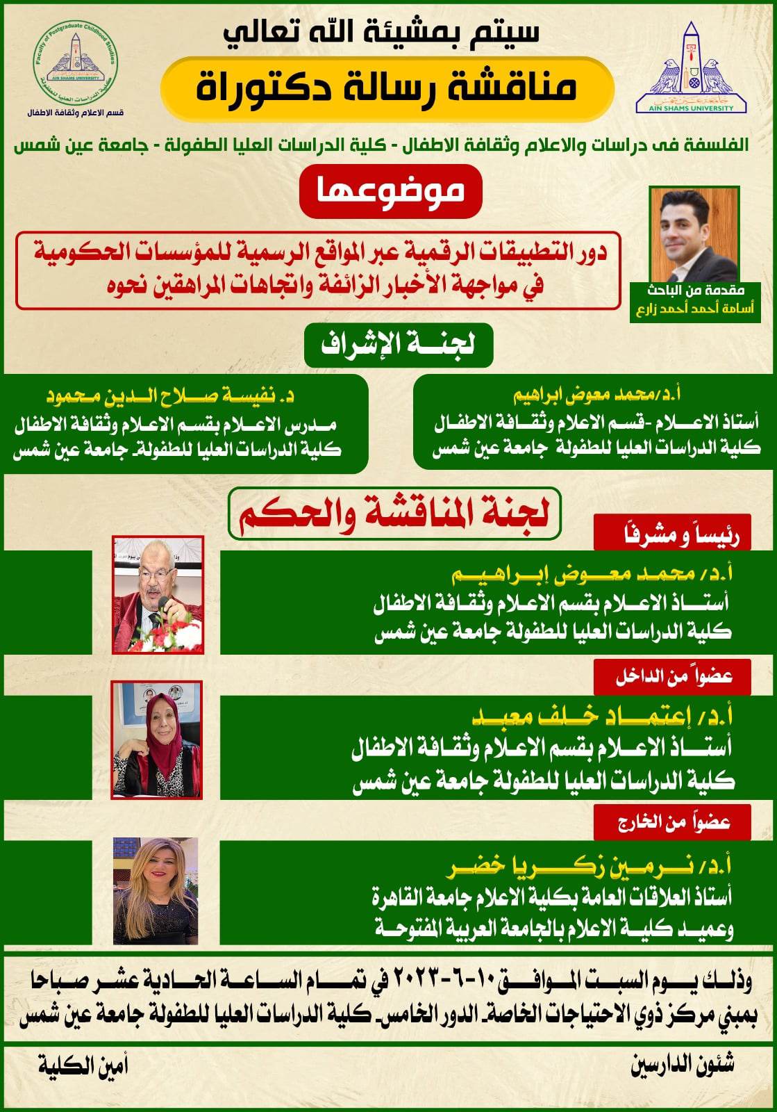 يناقش الباحث أسامة أحمد زارع، رسالة الدكتوراه في الإعلام المقدمة لكلية الدراسات العليا للطفولة، قسم الإعلام يوم السبت القادم الموافق 10/6، تحت عنوان “دور التطبيقات الرقمية عبرالمواقع الرسمية للمؤسسات الحكومية في مواجهة الأخبار الزائفة واتجاهات المراهقين نحوه”.