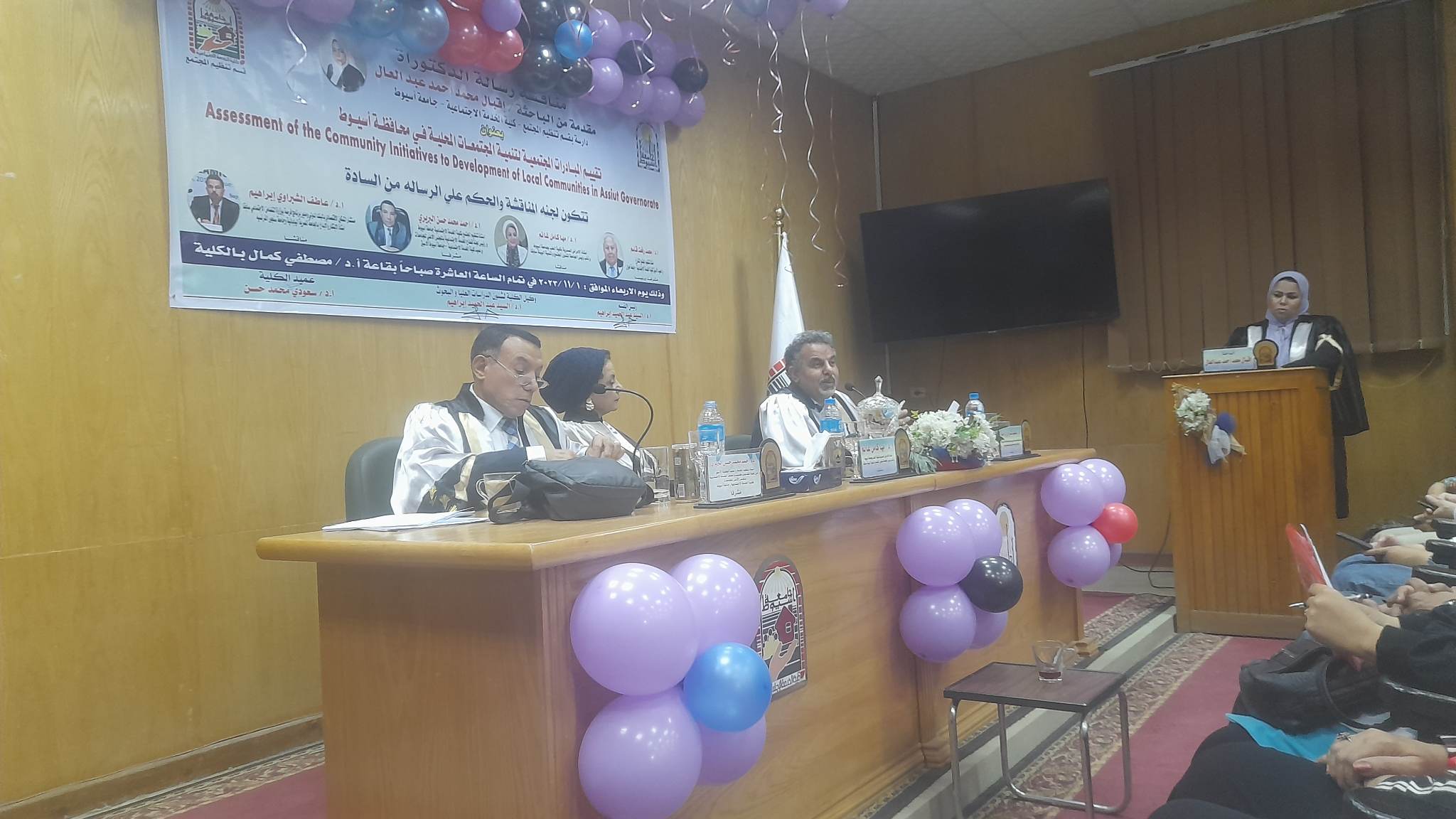 وتشكلت لجنة المناقشة والحكم من الدكتور محمد رفعت قاسم أستاذ تنظيم المجتمع والعميد الأسبق لكلية الخدمة الاجتماعية بجامعة حلوان مشرفا ومناقشا