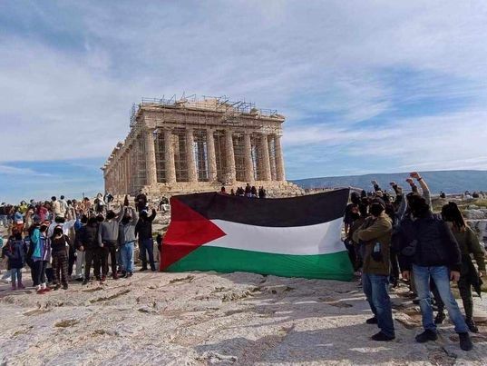 رفعت مجموعة مؤيدةلفلسطين في العاصمة اليونانية أثينا، العلم الفلسطيني أمام معبد الأكروبوليس التاريخي ونصب الجندي المجهول.