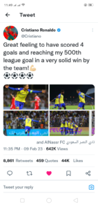 غرد البرتغالي كريستيانو رونالدو لاعب النصر السعودي بعد انتهاء مباراة فريقه مع الوحدة والتي سجل خلالها أربعة أهداف قائلاً: