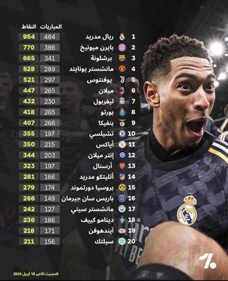 تصدر نادي ريال مدريد الإسباني الملكي قائمة أحدث تصنيف للأندية في التاريخ الأوروبي الحديث ( تصنيف ابريل 2024 )،برصيد 954من النقاط لعدد 484 مباراة. كما احتل النادي البافاري نادي بايرن ميونيخ الألماني المرتبة الثانية برصيد 770من النقاط لعدد 386 من المباريات.