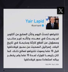 واتهم زعيم المعارضة الإسرائيلية نتنياهو بافتعال مسألة محور فيلادلفيا لإحباط الوصول لصفقة قد تؤدي لانهيار حكومته.