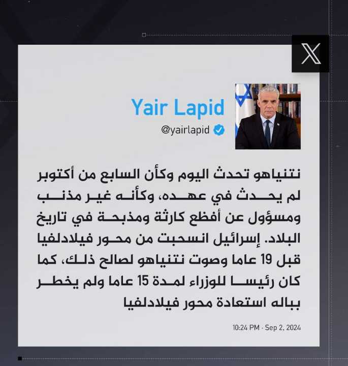 حيث سبق للابيد أن قال في وقت سابق إن الحكومة تخلت عن إسرائيل ويجب استبدالها، كما اتهم الحكومة بعدم امتلاك خطة لليوم الثاني لحرب غزة ولا إدارة إستراتيجية لها.