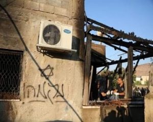 ولم يكتف هؤلاء المتطرفين من إحراق تلك الاسرة ، بل كتبوا شعارتهم العنصرية باللغة العبرية «يحيا الانتقام» على جدران البيت المحترق وعلى جدران المنازل المجاورة ، )) ويتوعدون كل الفلسطينيين بالانتقام منهم جميعا طالما انهم موجودون على أرض الميعاد المزعوم . إنهم لا يجيدون غير لغة الانتقام والكراهية. .
