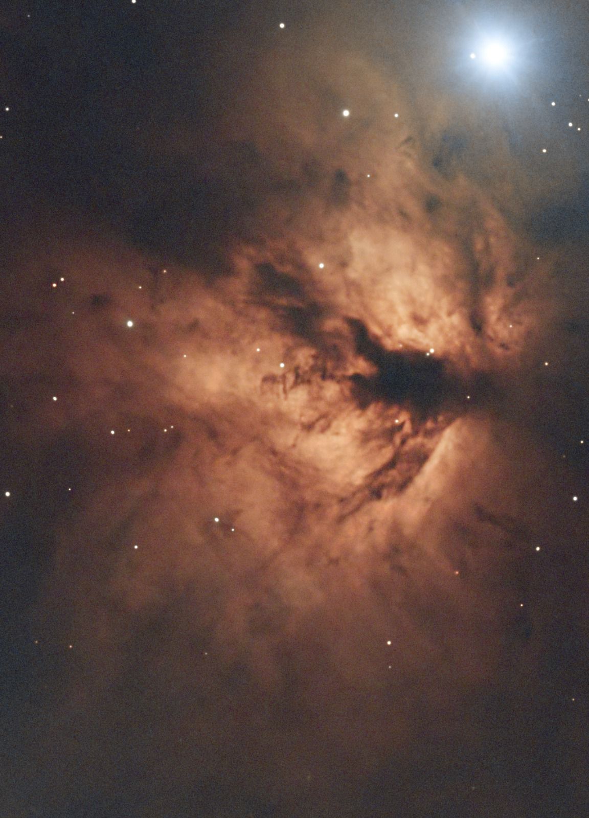 وفي يسار الصورة يقع سديم آخر، يسمى سديم “الشعلة” نظرا لشبه شكله بشعلة النار، وهو سديم انبعاث يشع بهذا اللون بسبب تأين غاز الهيدروجين نتيجة لوجود نجوم ساطعة وحارة بالقرب منه، وعلى الرغم من وقوع نجم “النطاق” ظاهريا بالقرب منه، إلا أنه لا يوجد رابط فيزيائي بينهما، وهو ليس سبب توهج السديم، بل السبب هو وجود عنقود من النجوم تقع في قلب السديم، ولا يمكن رؤيتها بالأشعة المرئية بسبب وجود سديم مظلم يظهر بشكل واضح في الصورة، وهو يحجب النجوم والسديم الواقعة خلفه.