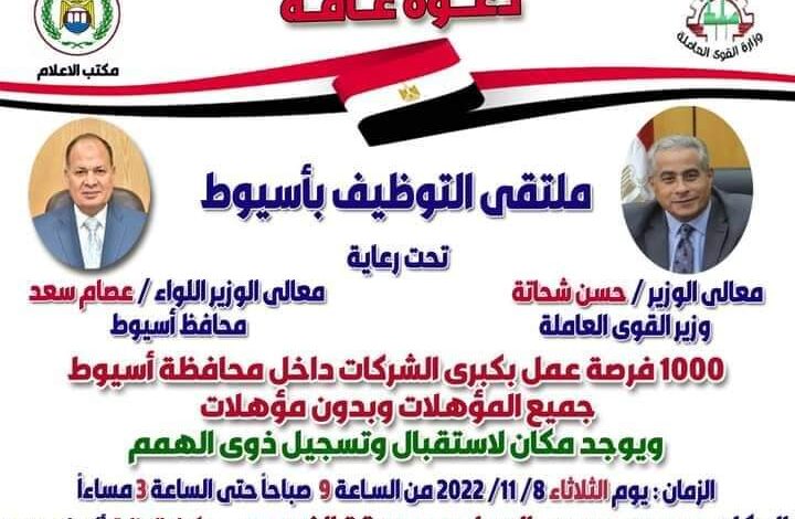 وذلك لتوفير أكثر من 1000 فرصة عمل للشباب من الجنسين بمشاركة العديد من شركات القطاع الخاص بهدف توفير فرص عمل للشباب الأسيوطي الحاصلين على المؤهلات الدراسية المختلفة أو بدون مؤهلات من سن 19 عام وحتى 55 عام فضلًا عن فرص للتدريب للتأهيل لسوق العمل وتخصيص مكان لاستقبال ذوى الهمم من ابناء المحافظة وتسجيلهم لتمكينهم من الحصول على فرص عمل مناسبة ،تحت رعاية ودعم الاستاذ حسن شحاتة وزير القوى العاملة ومحافظ أسيوط وذلك في إطار جهود الدولة والقيادة السياسية للقضاء على البطالة وتنفيذ خطط التنمية المستدامة ورؤية مصر 2030
