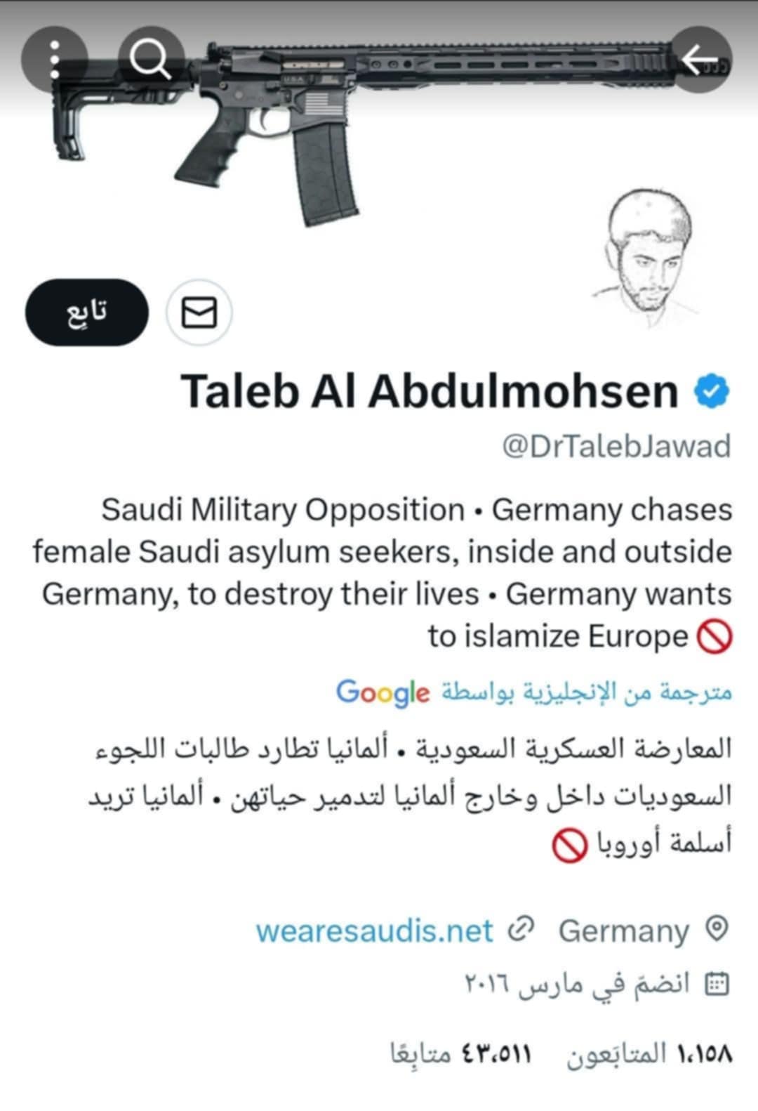 تداول نشطاء وبعض حسابات التواصل الاجتماعي معلومات حول هوية المتهم بحادثة الدهس في ألمانيا، حيث يُزعم أن اسمه “طالب عبد المحسن” وهو طبيب من أصل سعودي يبلغ من العمر 50 عامًا ويقيم في ألمانيا منذ عام 2006.