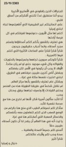 واختتمت المحتجزة “أتمنى لكم جميعا الصحة والعافية.. صحة وحب لكم ولأبناء عائلاتكم.. شكرا كثيرا”.
