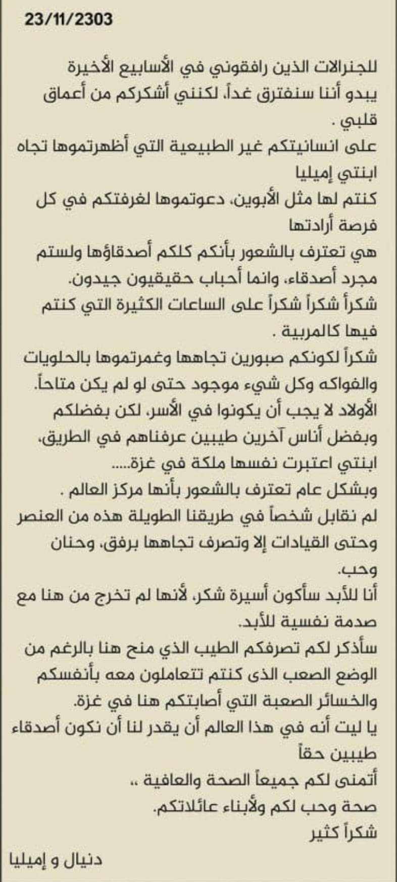شكرا لكونكم صبورين تجاهها، وغمرتموها بالحلويات والفواكه، وكل شيء موجود ولو لم يكن متاحا، أنا للأبد سأكون أسيرة شكر، لأن ابنتي لم تخرج من هنا بصدمة نفسية للأبد