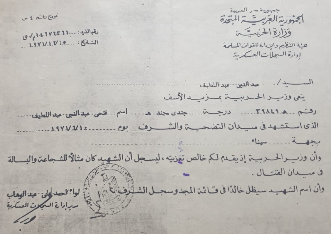 إنه النعي الوارد من السجلات العسكرية عن استشهاد ابنه فتحي ، إنها اللحظة التي كان ينتظر فيها وصول خبر سار عن ابنه ، إلا أن الخطاب كان جافاً وصادماً للأسرة كلها ، وخيم الحزن على كل ركن في البيت.