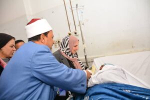 جاء ذلك خلال تواصل فضيلة الإمام الأكبر من خلال اتصال هاتفى مع الشاب السودانى أثناء زيارة وفد موسع من الأزهر الشريف موفد من فضيلته برئاسة الدكتورة إلهام شاهين الأمين العام المساعد لمجمع البحوث الإسلامية لشئون الواعظات للاطمئنان على الوضع الصحى للشاب السودانى والسيدة المصرية وبحضور الدكتورة مها غانم القائم بعمل رئيس جامعة أسيوط والدكتور علاء عطية عميد كلية الطب ورئيس مجلس إدارة مستشفيات أسيوط الجامعية والدكتور إيهاب فوزى المدير التنفيذى لمستشفيات أسيوط الجامعية