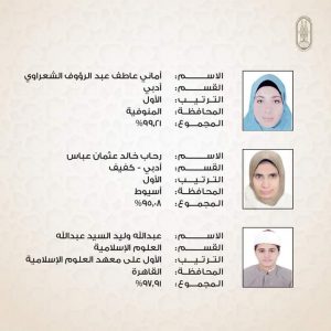 • أماني عاطف عبد الرؤوف الشعراوي، الأول (أدبي)، النسبة المئوية (99.21%).