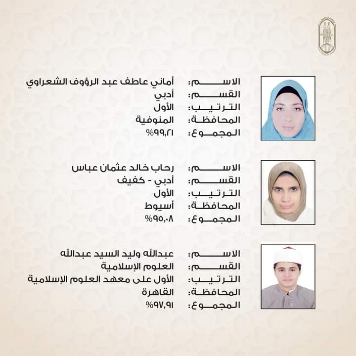 وجاء أوائل الثانوية الأزهرية للعام الدراسي كالآتي: