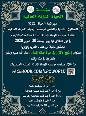 فى ذكرى مولد خير البشر سيدنا محمد صلى الله عليه وسلم ومن خلال صفحة مؤسسة الحياة المتزنة وبقيادة أيقونة الإتزان على مستوي العالم د. أحمد سمير وفريق المؤسسة ، تنطلق المؤسسة ولأول مرة عالميًا صالونها الثقافي والعلمي بعنوان ( منهج الإتزان حياة أعظم إنسان ) رسول الله محمد صلى الله عليه وسلم .