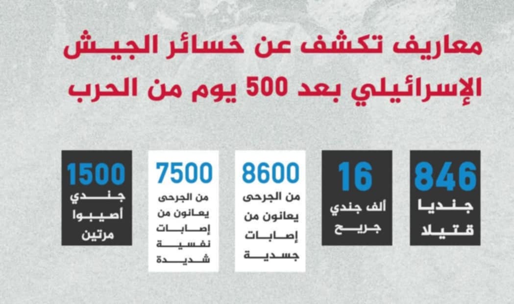 كشفت صحيفة معاريف الإسرائيلية، في عددها الصادر يوم الاثنين، عن أرقام جديدة تخص خسائر الجيش الإسرائيلي بعد 500 يوم من الحرب على قطاع غزة. وذكرت الصحيفة أن إجمالي عدد الجرحى في صفوف الجيش الإسرائيلي بلغ 16 ألف جندي منذ بدء الحرب في 7 أكتوبر 2023.