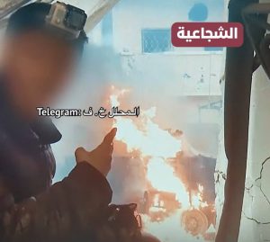 صورة تبعث الأمل:أحد مجاهدي القسام يأخذ صورة تذكارية مع دبابة متفحمة