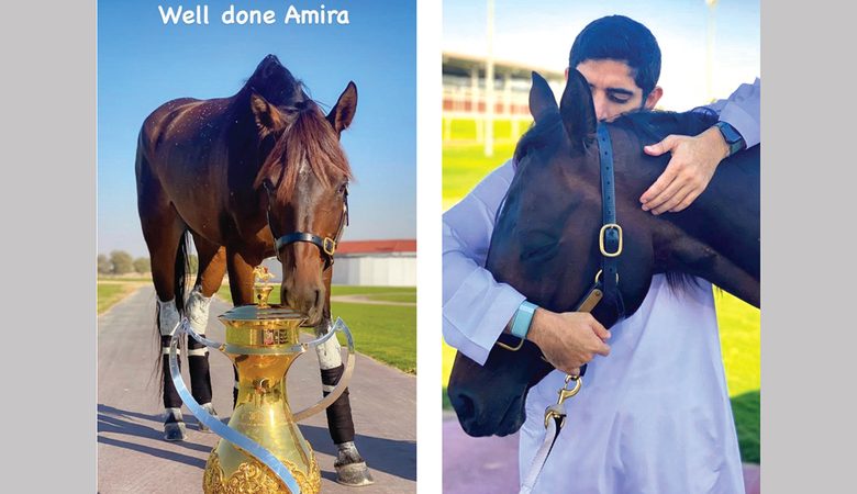 ونشر الشيخ حمدان على حسابه في «إنستغرام» صورتين للخيل: الأولى صورة تجمعه مع الجواد الفائز باللقب، والثانية صورة «أميرة» مع الكأس، وعلق قائلاً: «عمل جيد أميرة».