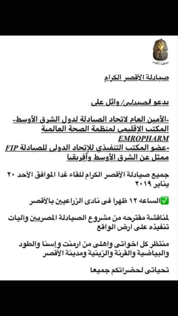 من ناحية أخرى .. وجه الدكتور وائل علي علي دعوة خاصة لصيادلة محافظة الأقصر لحضور الندوات والمؤتمرات التي سيقيمها في محافظتهم ضمن مسيرته الإنتخابية ، بالتعاون مع أكبر صيادلة الأقصر الذين رحبوا بقدومه في أرض طيبة الطيبة .