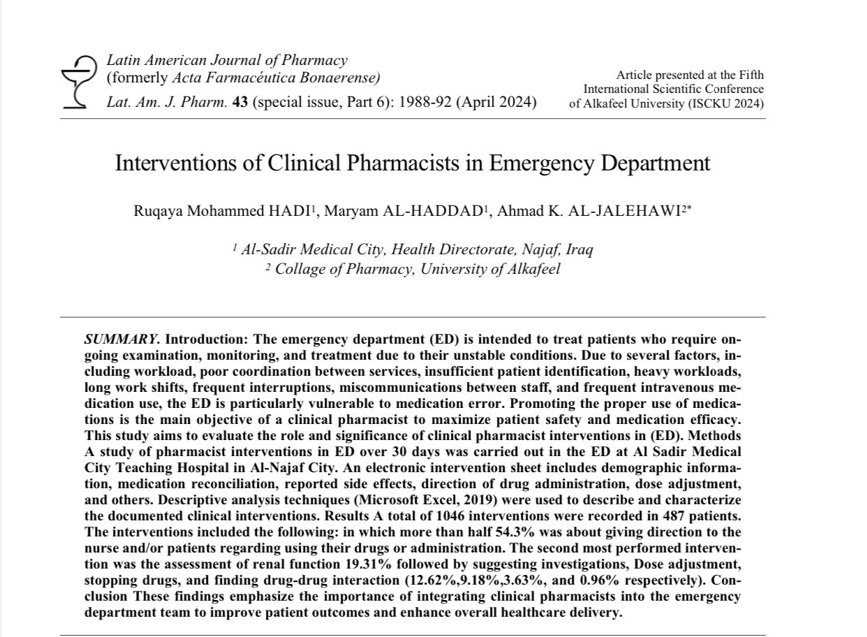 ركز البحث، الذي حمل عنوان “تدخلات الصيادلة السريريين في قسم الطوارئ”، على إبراز الدور الحيوي للصيدلي السريري في الرعاية الصحية المقدمة في أقسام الطوارئ بالمستشفيات.
