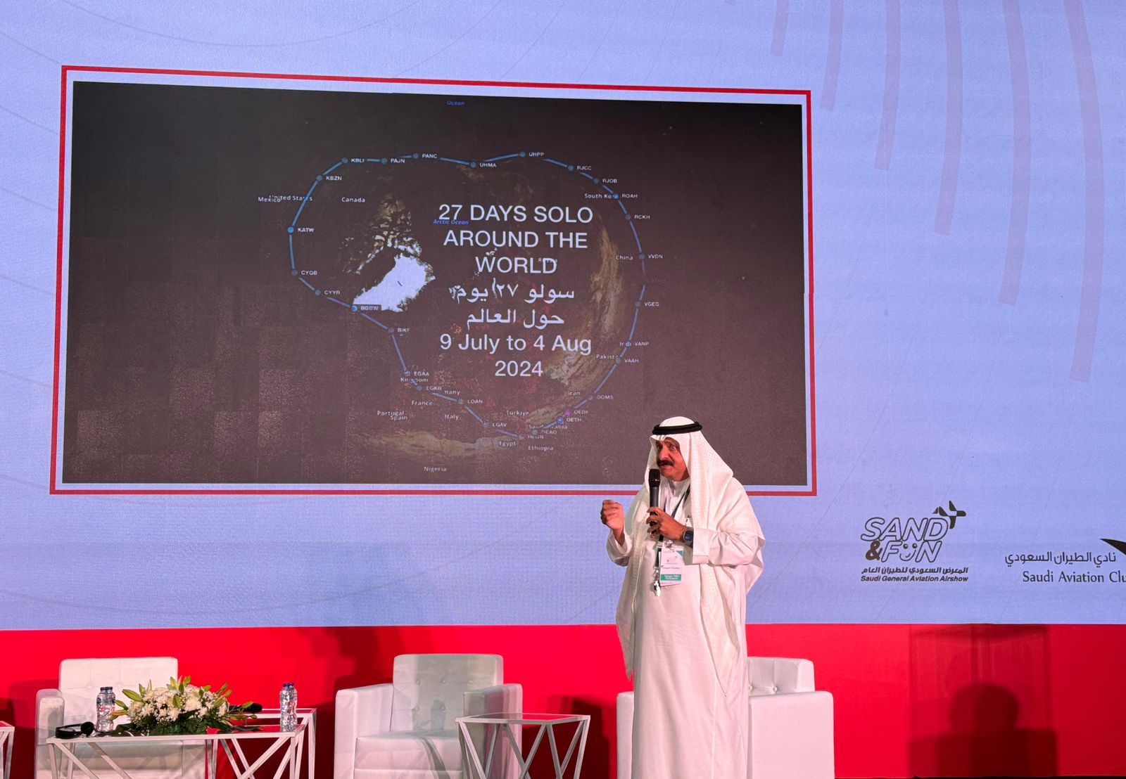 وأشار في محاضرته التي شهدت حضورا كثيفا وتصفيقا حارا من المهتمين بصناعة الطيران وشغفه أنه عبر سبعة أبحر هي بحر العرب، وبحر الصين، وبحر اليابان وبحر بيرنق والبحر الأبيض المتوسط والبحر الأحمر في 27 يوما، حيث انطلقت الرحة في التاسع من شهر يوليو 2024 إلى الرابع من شهر أغسطس ولم يتوقف خلالها سوى 3 أيام لصيانة الطائرة فقط، كما شارك أيضا في أكبر فعالية طيران بالعام EZZ AIR VENTURE OSHKISH 2024 ، مبينا أنه الارتفاعات الجوية التي حلق فيها كانت تتروح بين 11 ألف و 19 ألف قدم، وقال أن واحد من 142 طياراً لفوا العالم منذ 1933 .