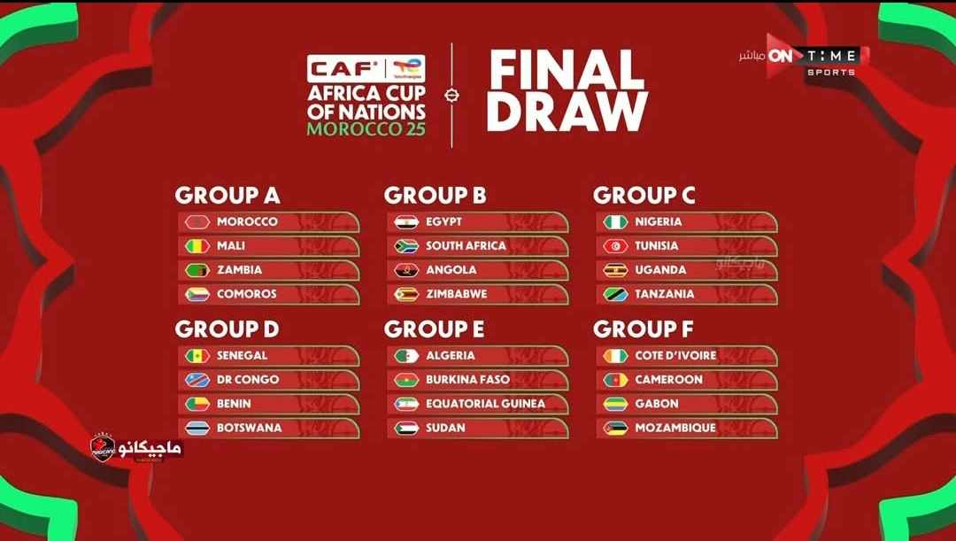 أسفرت قرعة بطولة الأمم الأفريقية التى ستقام بدولة المغرب 2025 عن مواجهات من العيار الثقيل ومنافسات شرسه على بطاقات التأهل من دوري المجموعات حيث أسفرت القرعة عن وقوع منتخب مصر مع منتخبات جنوب افريقيا وانجولا وزمبابوى واسفرت أيضا عن مواجهات ناريه بالمجموعات الاخري وهى كالتالى: