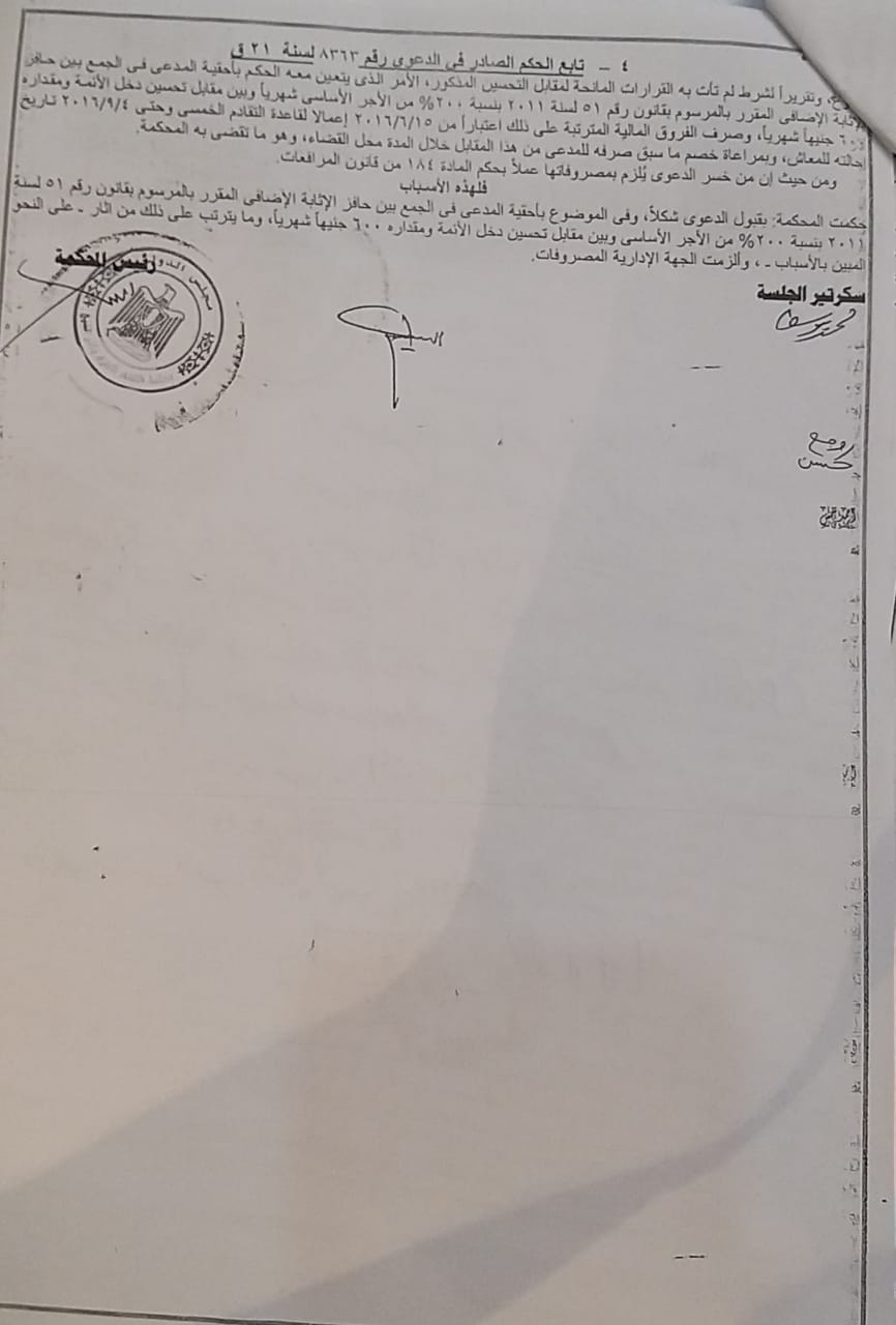 كما صدر الحكم برئاسة المستشار علي عوض الملهطاني ، وعضوية المستشارين محمد سعد الدين احسن ابو عماره والمستشار الدكتور برتي سامي ابراهيم جندي والمستشار المساعد محمد محمد ابو السعود مرسي في عدة دعاوي منها الدعوي رقم ٨٣٦٩/٢١ق