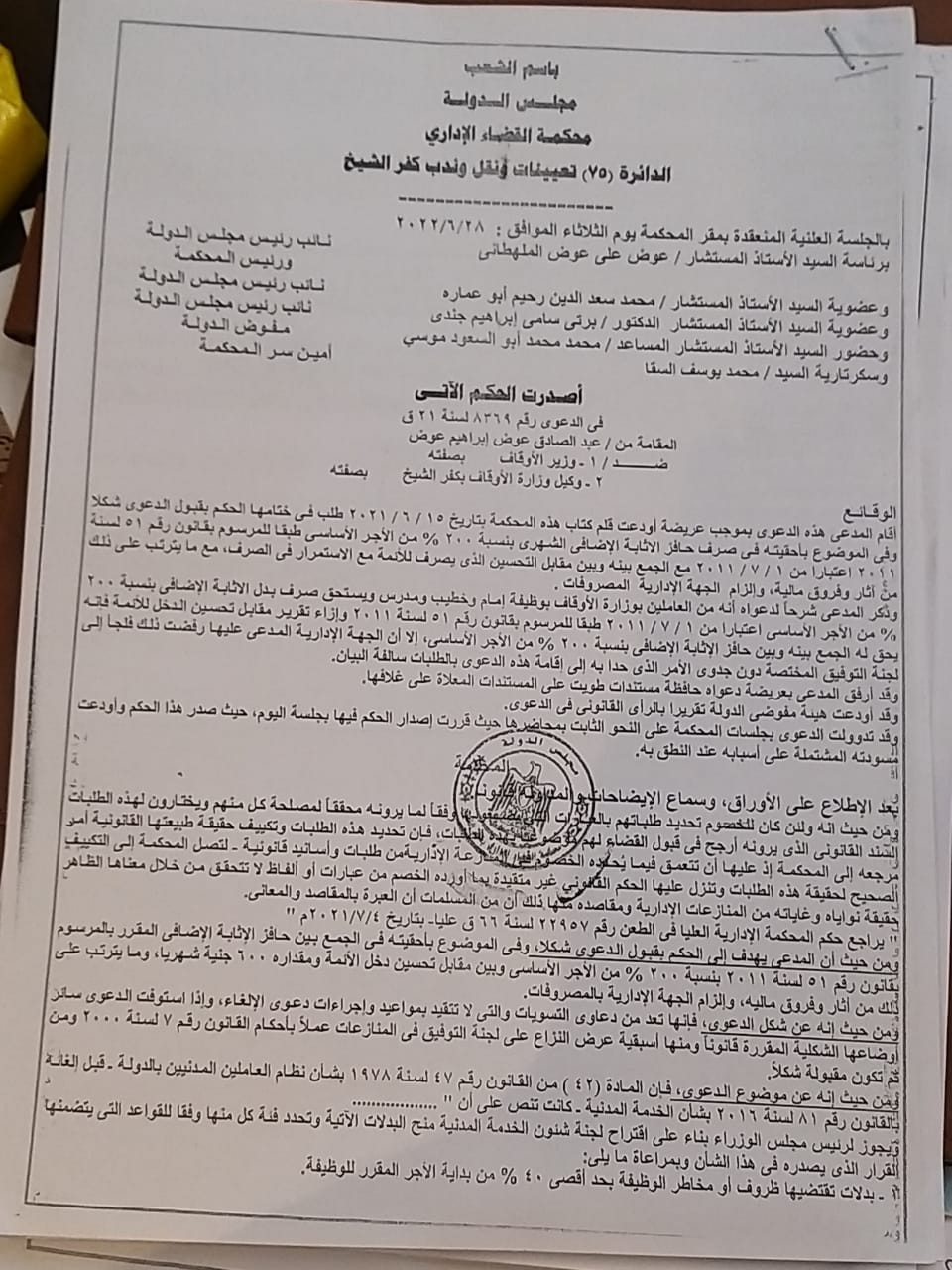 أصدرت المحكمة الإدارية بكفر الشيخ الدائرة ٧٥ برئاسة المستشار عوض علي عوض الملهطاني حكما هاما بشأن أحقية أئمة المساجد في الجمع بين حافز الاثابة المقرر بالمرسوم بقانون ٥١ لسنة ٢٠١١ م بنسبة ٢٠٠% من الأجر الأساسي وبين مقابل تحسين دخل الأئمة بواقع ٦٠٠ جنيه شهريا .