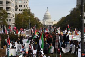 وقد خرج آلاف المتظاهرين في مسيرة بالعاصمة واشنطن للمطالبة بوقف إطلاق النار في الحرب الدائرة بين إسرائيل وحركة حماس في قطاع غزة.