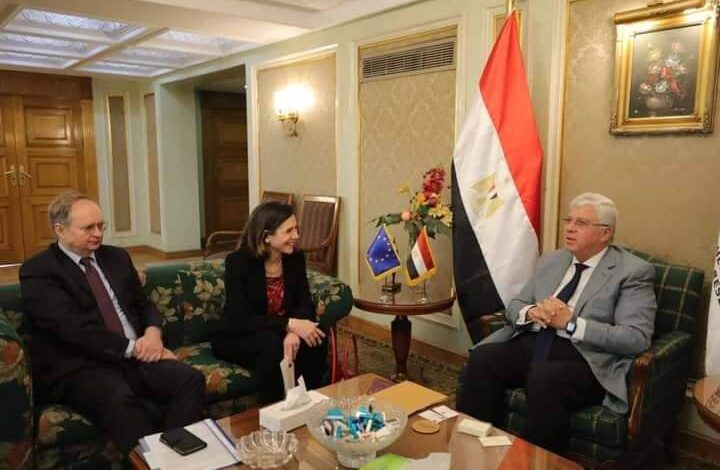وزير التعليم العالي والبحث العلمي ماريا كريستينا روسو مدير إدارة النهج العالمى والتعاون الدولى فى البحوث والابتكار بالمفوضية الأوروبية، والسفيرة كريستيان برجر سفير الاتحاد الأوروبى بالقاهرة والوفد المرافق لهما لبحث سبل تعزيز التعاون بين مصر ودول الاتحاد الأوروبى، وذلك بمقر الوزارة