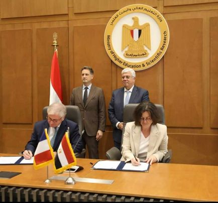 شهد الدكتور أيمن عاشور وزير التعليم العالي والبحث العلمي، توقيع اتفاق تعاون بين الجامعة الفرنسية في مصر وجامعة باريس 1 بانتيون سوربون الفرنسية؛ لإطلاق برامج جديدة في إدارة الفنادق، والمنشآت السياحية، وإدارة السياحة التراثية، بحضور البروفيسور كريستين نياو ليدوك، رئيسة جامعة باريس 1 بانتيون سوربون، والبروفيسور دوني داربي، رئيس الجامعة الفرنسية في مصر، والسيد رافائيل مارتين دي لاغارد، القائم بأعمال السفير الفرنسي بالقاهرة، والسيد ديفيد سادولي، المستشار الثقافي بالسفارة الفرنسية بالقاهرة، وأعضاء هيئة التدريس، ولفيف من الشخصيات العامة، وذلك بمقر الوزارة بالعاصمة الإدارية الجديدة.