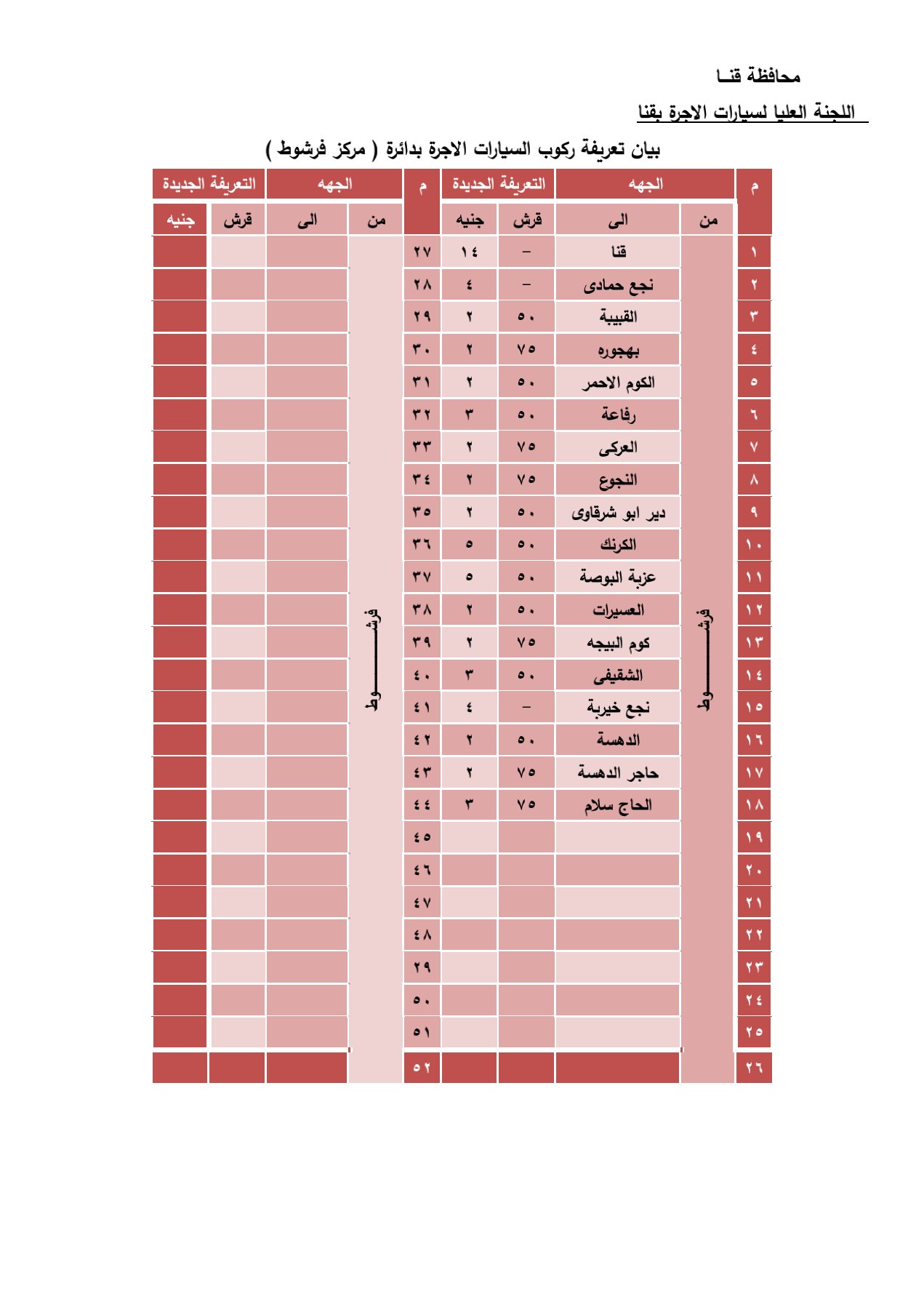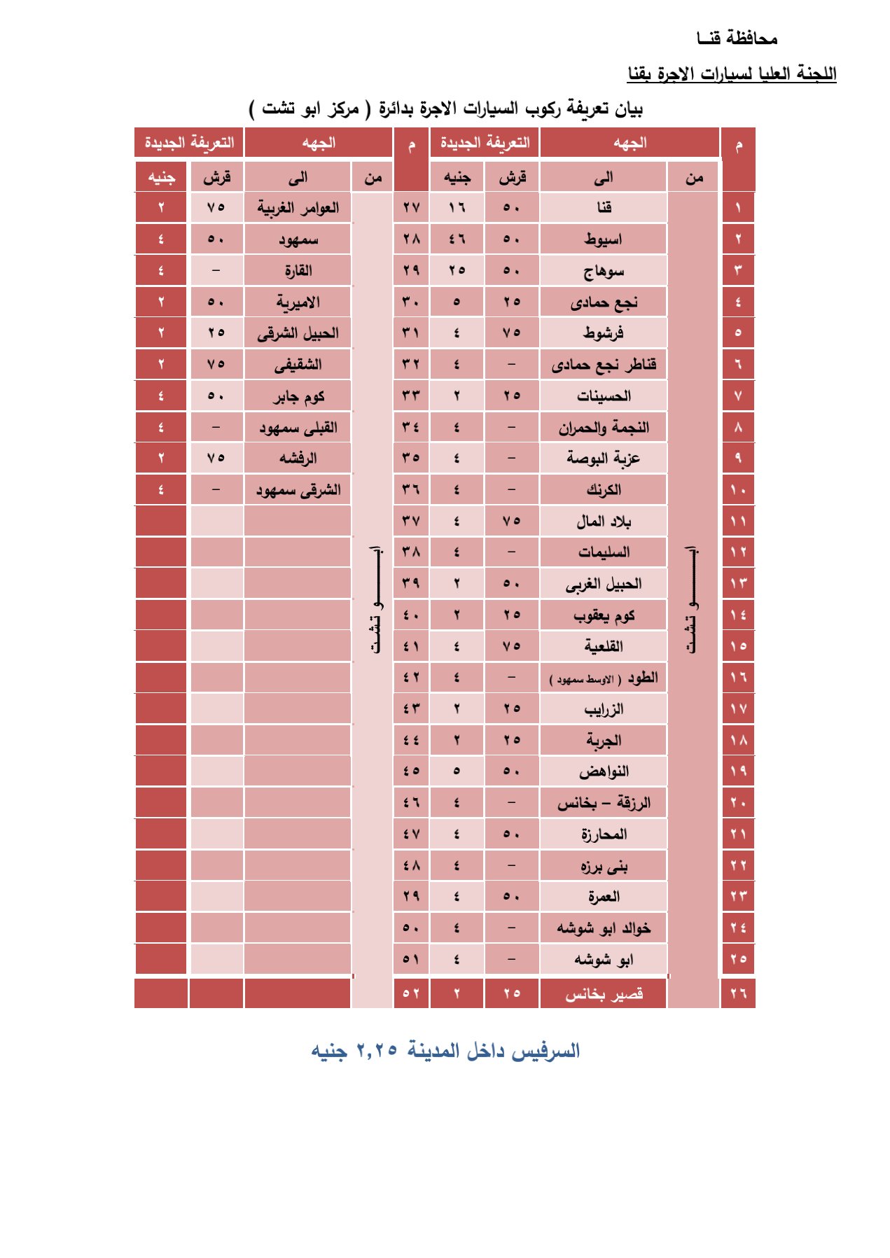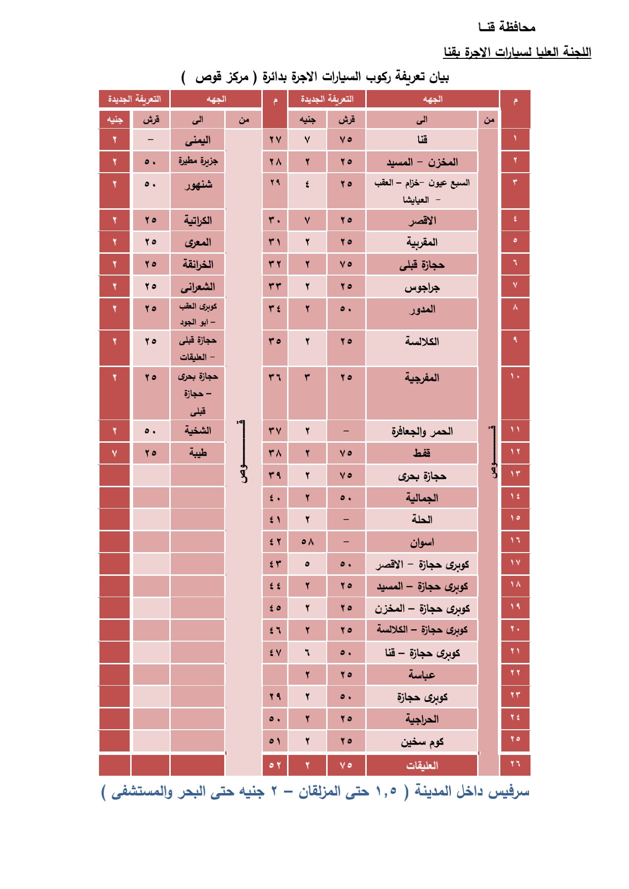 وجاءت قائمة تعريفة الأجرة لخطوط سير سيارات الأجرة الداخلية والخارجية كالتالي .