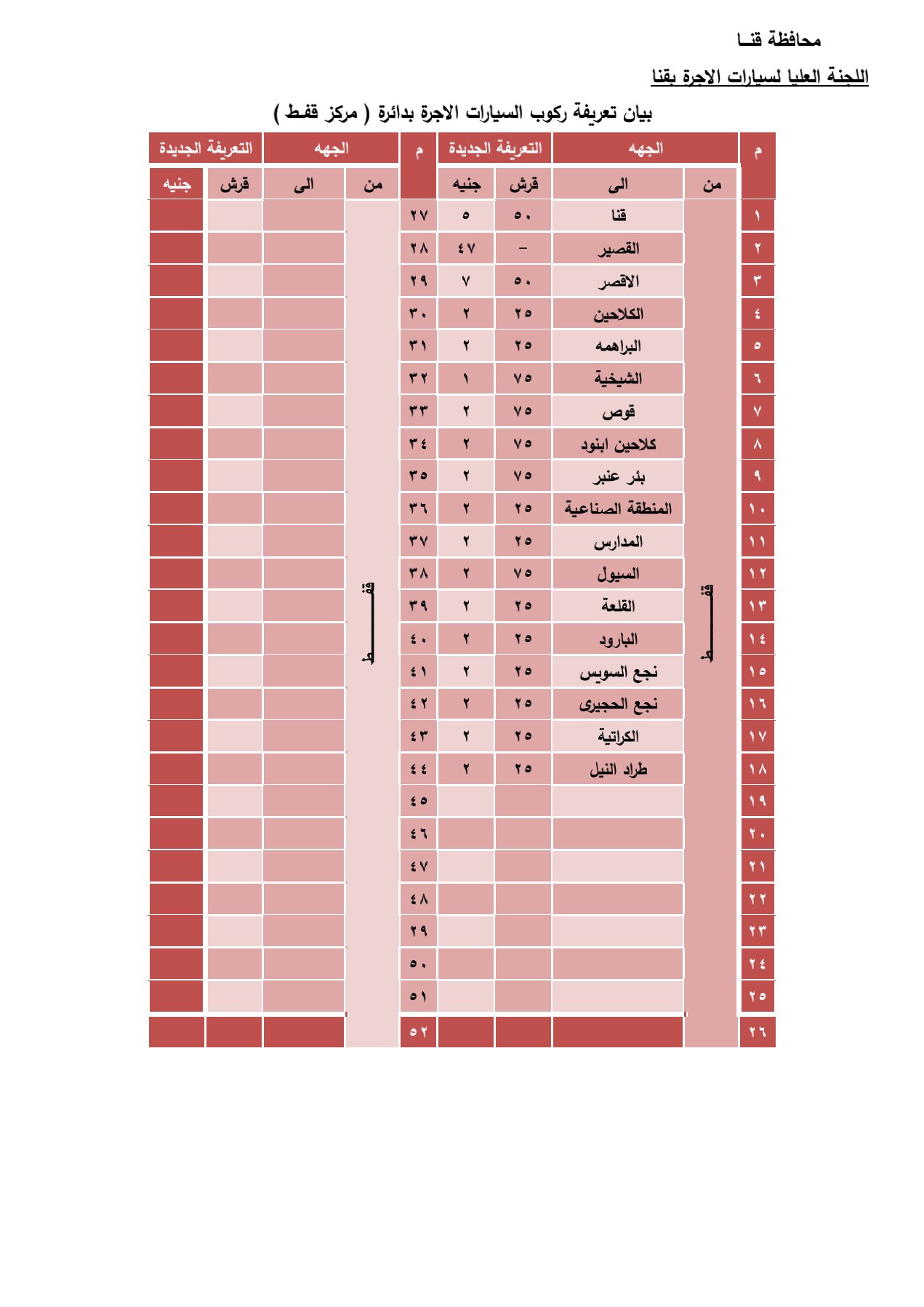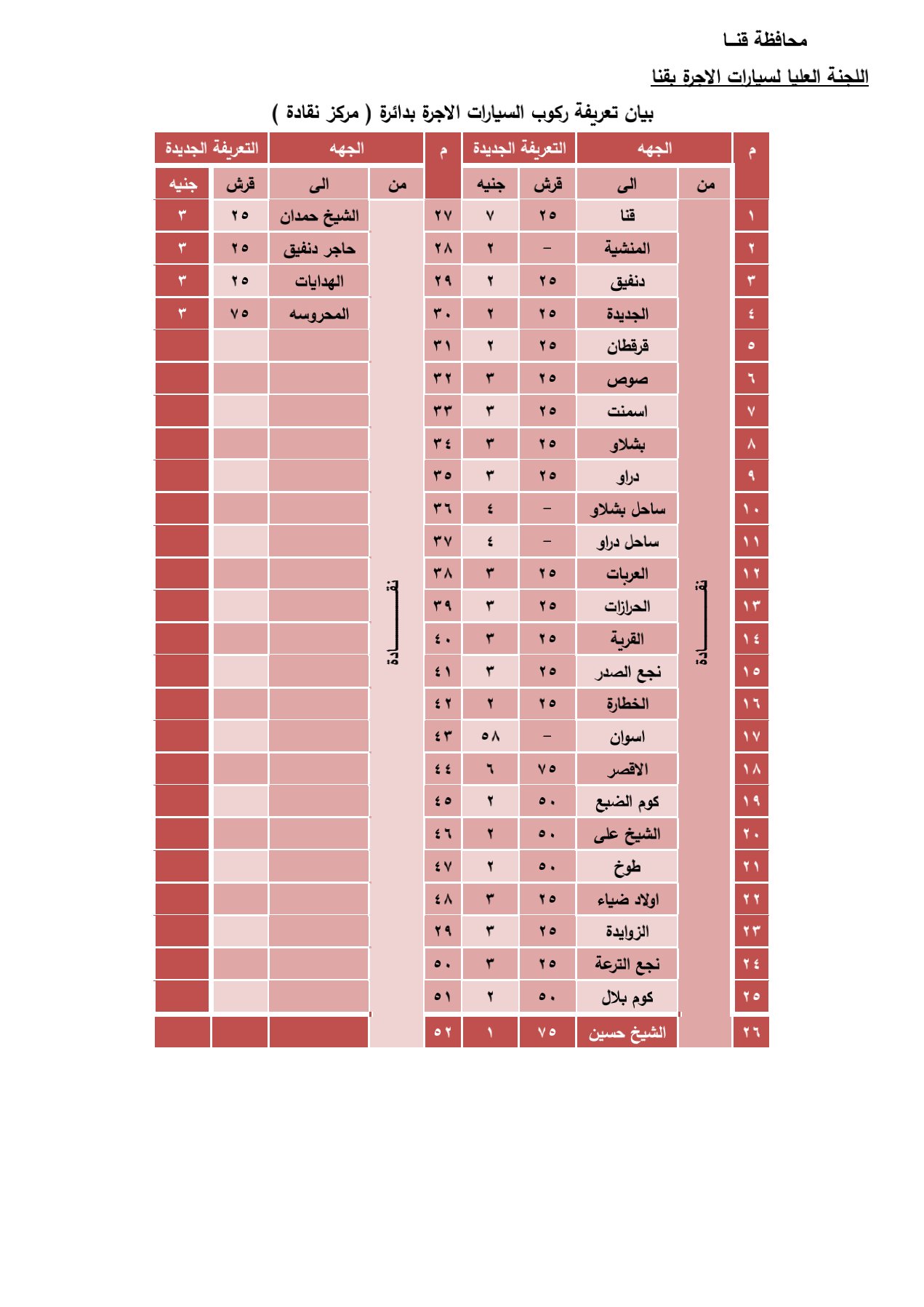 قرر اللواء أشرف الداودى محافظ قنا، تحريك تعريفة الركوب الحالية لسيارات الأجرة والسرفيس، والتاكسي، سواء لخطوط السرفيس الداخلى أو الربط مع المحافظات والأقاليم مع انتظام سير العمل داخل جميع المواقف على مستوى مراكز ومدن المحافظة، و ذلك عقب قرار لجنة التسعير التلقائي للمنتجات البترولية المعنية بوزارة البترول والتعدين تحريك أسعار لتر السولار بدء من الساعة 2 صباحا اليوم الخميس من 7,25جنيه إلى8,25 جنيه.