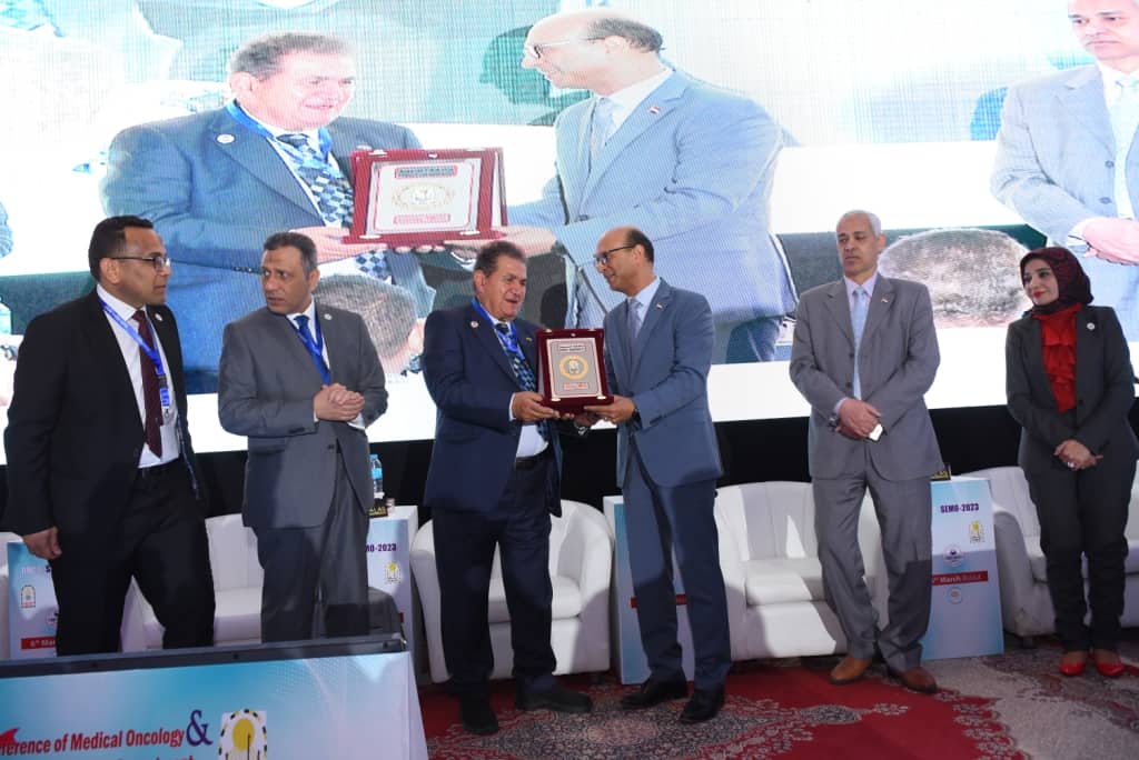 وفي الختام تقدم الدكتور أحمد المنشاوي رئيس جامعة أسيوط بتقديم درع جامعة أسيوط تقديراً وعرفاناً بالجميل للدكتور محمد شلبي نائب رئيس الجامعة الأسبق ومؤسس معهد جنوب مصر الأورام لما له من بصمات واضحة في إنجاح المنظومة الطبية