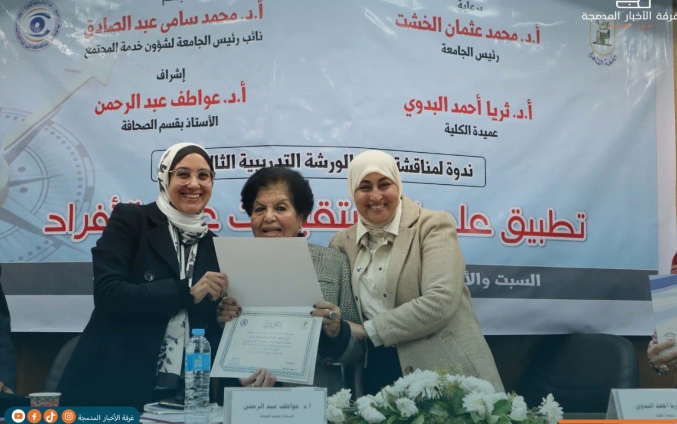 أ.د وسام نصر وكيلة الكلية للدراسات العليا والبحوث، بإشراف أ.د عواطف عبد الرحمن الأستاذة بقسم الصحافة،