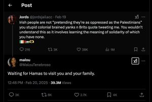 بدأت القصة عندما علّقت امرأة الإسرائيلية غير معروفة اسمها (مالو) على الناشطة الأيرلندية “جوردز” بتهديد مبطن: “في انتظار زيارة حماس لك ولعائلتك.”