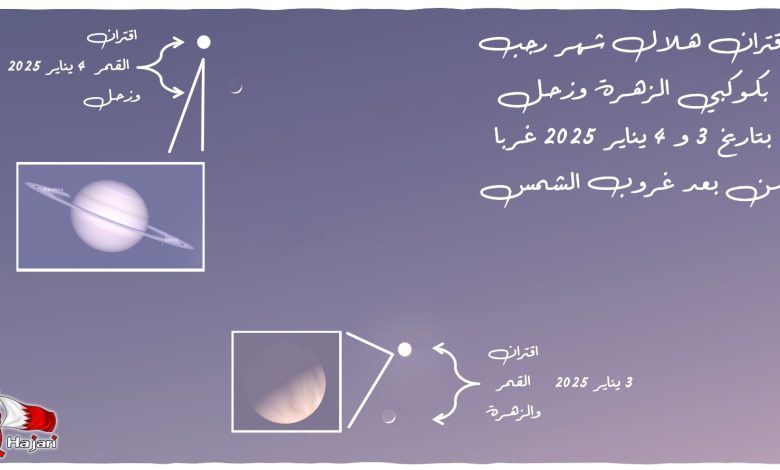 ومن جهة أخرى قال الحجري بأن البحرين ستشهد 3 ظواهر لاقتران 3 كواكب بالقمر بزاوية أقل من 3 درجات بينهما، وذلك مع مطلع شهر رجب لظاهرتين منهم، ومنها ما يرصد بالعين المجردة بصعوبة ويفضل رصدها من خلال استخدام المناظير أو التلسكوبات ويمكن تصويرهم أيضا، ليكون ترتيبها تصاعديا لشهر يناير لاقتران القمر بكوكب الزهرة غربا من بعد غروب الشمس في تمام الساعة (04:58) مساء بتاريخ 3 يناير القادم بزاوية استطالة ما بينهما لدرجتين و15 دقيقة ويكون موقعه مائلا قليلا عن شمال الهلال، وسيعاد في اليوم التالي اقتران القمر بكوكب زحل غربا وبتاريخ 4 يناير بزاوية استطالة لدرجتين و12 دقيقة ويكون موقعه من جهة الشمال الغربي للهلال، وأخيرا سيجاور القمر وهو في طور البدر لكوكب المريخ من بعد منتصف الليل إلى أفول القمر فجرا بتاريخ 14 يناير القادم.