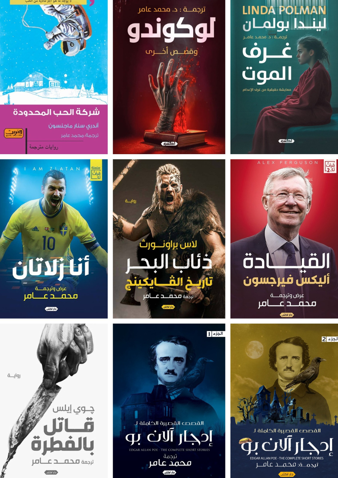 وهناك ترجمات أخرى للدكتور عامر تشارك في معرض هذا العام مثل (أنا زلاتان) و(القيادة) وهما من أدب السيرة الذاتية لاثنين من كبار شخصيات كرة القدم هما اللاعب السويدي الشهير زلاتان إبراهيموفيتش والمدرب الإسكتلندي المُخضرم سير آليكس فيرجسون، هذا بخلاف كتاب (ذئاب البحر) للمؤلف الأمريكي لارس براونورث، والذي يُعد تأريخًا مُفصلًا لثقافة الفايكنج في الدول الإسكندنافية، بالإضافة إلى كتاب (لوكوندو) وهو مجموعة من القصص القصيرة المُختارة من أدب الرعب العالمي.