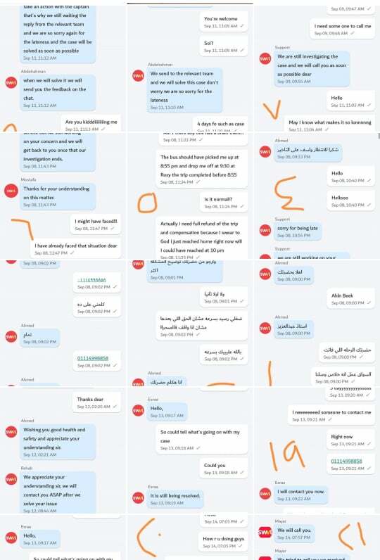 وعلى سبيل المثال لا الحصر، تلقينا شكوى من الأستاذة/ريم، موظفة في إحدى الشركات، وقالت أن الرحلة تأخرت أكثر من مرة في أيام مختلفة، وفي إحدى المرات كانت تنتظر في مكان صحراوي ولا يمكن لفتاة أو امرأة أن تقف بمفردها في هذا المكان، وحاولت التواصل مع المسؤول في سويفل لكنه تركها مدة قربت الساعة تقريبا، وأرفقتنا “ريم” باسكرينات للمحادثات الكثيرة جدا مع مسؤول سويفل بلا جدوى .