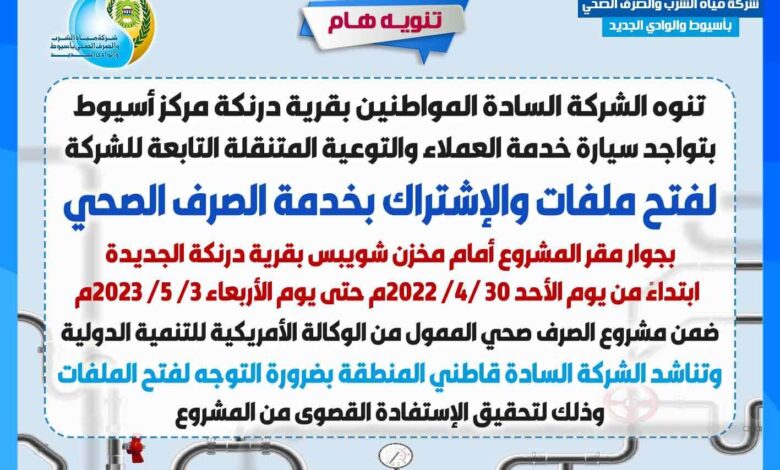 تعلن شركة مياه الشرب والصرف الصحي بأسيوط والوادي الجديد مواطني قرية درنكة بمركز اسيوط عن تواجد سيارة خدمة العملاء المتنقلة بجوار دير السيدة العذراء بقرية درنكة ابتداءا من الاحد 30/4/2023 وحتى يوم الاربعاء الموافق 3/5/2023 وذلك لفتح ملفات والاشتراك بخدمة الصرف الصحي و الممول من الوكالة الأمريكية للتنمية الدولية ضمن مشروع دعم حلول المياه المتكاملة، والذى يشمل عدد (3) محطات رفع (محطة دير درنكة الفرعية، محطة رفع دير درنكة المدمجةوالتى تعمل على طاقة تصميمية ٢٥٠٠ م٣ / اليوم ، محطة رفع درنكة الجديدة الرئيسية والتى تعمل على طاقة تصميمية ٣٨٨٨ م٣/ اليوم )، و21 كيلو متر طولي شبكات انحدار، 9 كيلو متر طولي خطوط الطرد، وعدد 3 آلاف وصلة منزلية، يستفيد منها أكثر من 8 آلاف نسمة فضلا عن 3 مليون زائر سنويا لمسار العائلة المقدسة