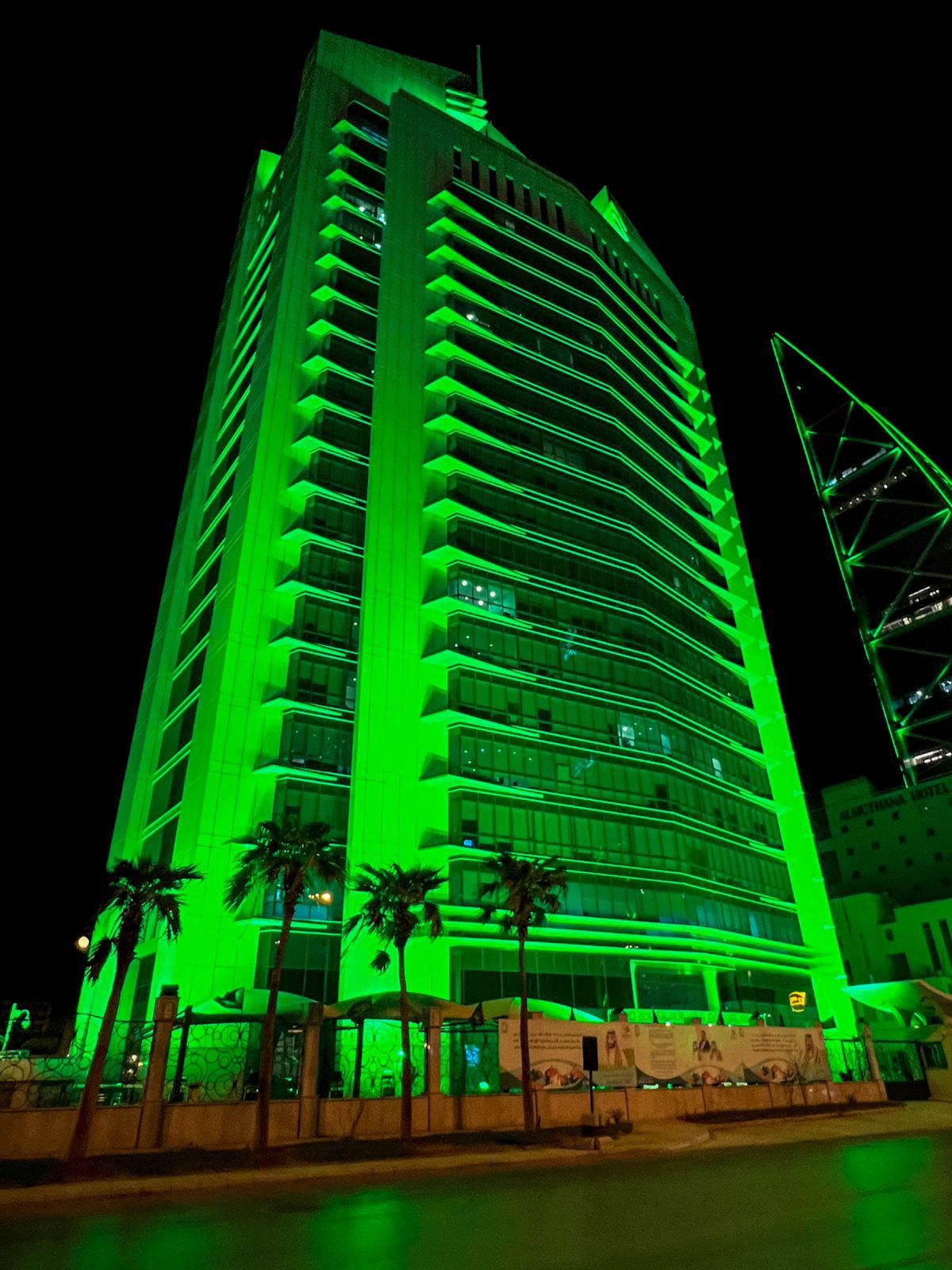 وقد تزين مبنى فرع منطقة الباحة والهيئات التابعة له باللون الأخضر بمناسبة اليوم الوطني السعودي *94* .