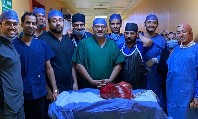 لإنقاذ مريضة باستئصال ورم ضخم بالرحم والمبيضين يزن 30 كيلو جراما، كان ملتصقاً بالإثني عشر