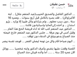 “‏أعرف الدكتور عبد المنعم جلال وابنه وائل الذي فقد بصره قبل 4 سنوات وعمره 16. لم يترك طبيباً إلا زاره، بل استدان وعالجه بألمانيا وإسبانيا بلا جدوى. حج هذا العام، وفي عرفة ظل يدعو لابنه خارج خيمته منذ الصباح، وكانت المفاجأة أن وائل استيقظ لصلاة الفجر مبصرا.”