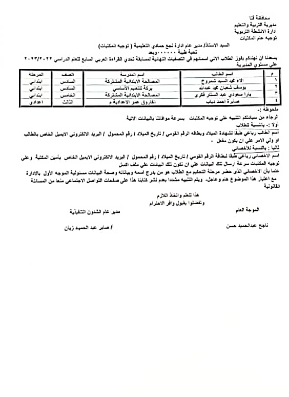 أعلنت إدارة الأنشطة التربوية ، بمديرية التربية والتعليم بقنا ، فوز 4 طلاب بمدارس إدارة نجع حمادي التعليمية ، من المشاركين في التصفيات النهائية لمسابقة تحدي القراءة العربي السابع للعام الدراسي 2022/2023 ، تحت رعاية الدكتور محمد السيد وكيل وزارة التربية والتعليم بقنا ، وإشراف صابر عبد الحميد زيان مدير عام الشؤون التنفيذية ، وتوجيه عام المكتبات بالمديرية .