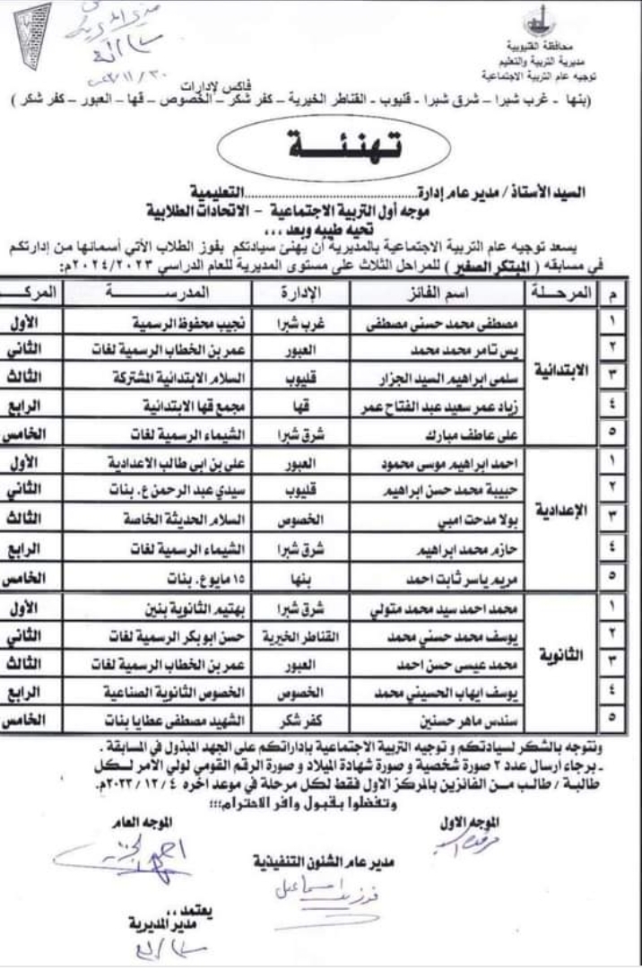 وكذلك قيادات الإدارة التعليمية بالقناطر الخيريه التى ترأسها الدكتورة / عايدة جبريل مديرة الاداره والأستاذة/ ابتسام ابوزيد وكيلة الاداره والأستاذة/ سماح عبده المدير التنفيذي لإدارة والاستاذ/ ياسر صقر مدير أمن الإدارة وكل رؤساء الأقسام ومديري المراحل بالديوان.