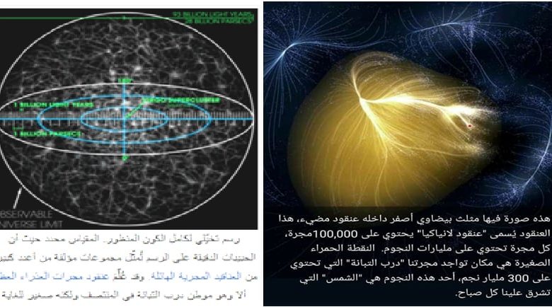ويرى كاتب هذه السطور أن ذلك يتفق مع نصف السماء الأولى، ويؤكد ذلك ما يقوله علماء الكونيات أن الكون المدرك يتضمن 5% مادة الأجرام السماوية ونسبة 95% منه فراغ يشمل المادة والطاقة المظلمة، فالكون المدرك يمثل فراغ كوني يضم 300 ألف مليون مجرة، يجمعها 10 ملايين عنقود مجري عملاق (الصورة المرفقة لعنقود لانياكيا المجري العملاق)، وكل عنقود مجري عملاق يضم أكثر من 100 ألف مجرة، كما أن مكونات الكون المدرك من العناقيد المجرية العملاقة تبدو للناظر من خارج الكون المدرك مثل الحبيبات المتناثرة (الصورة اليسرى) ثم يأتي فوق الكون المدرك البناء السماوي الكبير كجسم صلب ذو أبواب.