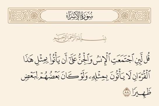 قال تعالى: { قُلْ لَئِنِ اجْتَمَعَتِ الْإِنْسُ وَ الْجِنُّ عَلَى أَنْ يَأْتُوا بِمِثْلِ هَذَا الْقُرْآنِ لَا يَأْتُونَ بِمِثْلِهِ وَ لَوْ كَانَ بَعْضُهُمْ لِبَعْضٍ ظَهِيرًا } [الإسراء: 88].